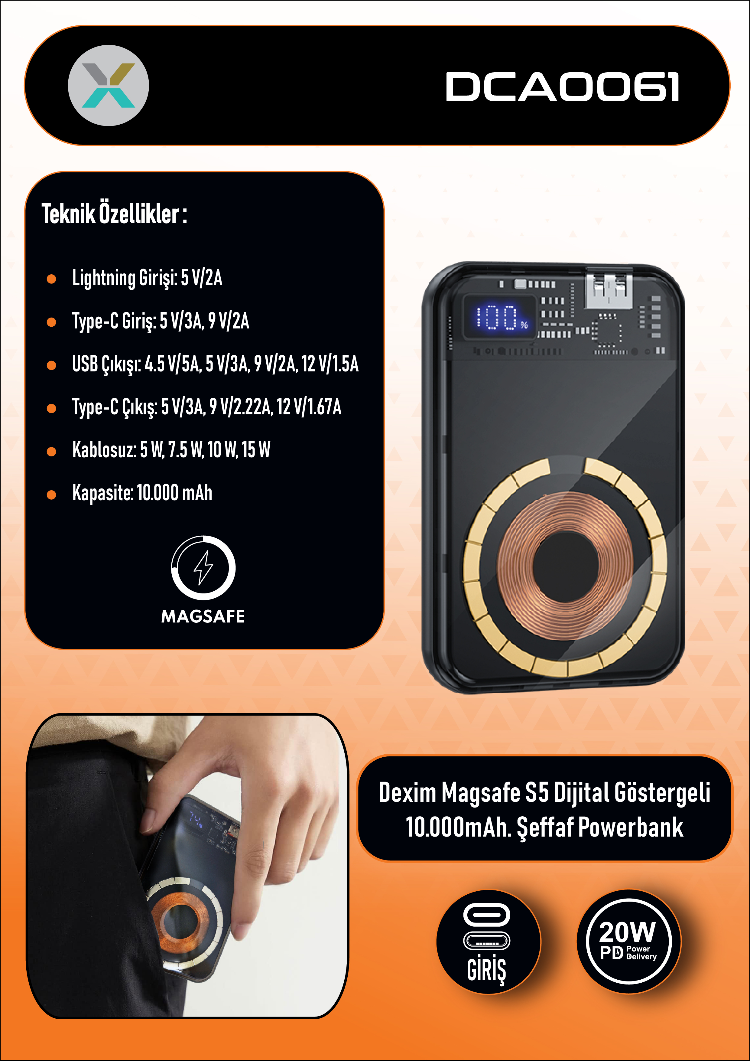 Dexim S5 10.000mAh PD Powerbank Şeffaf Magsafe Dijital Göstergeli Taşınabilir Hızlı Şarj Cihazı